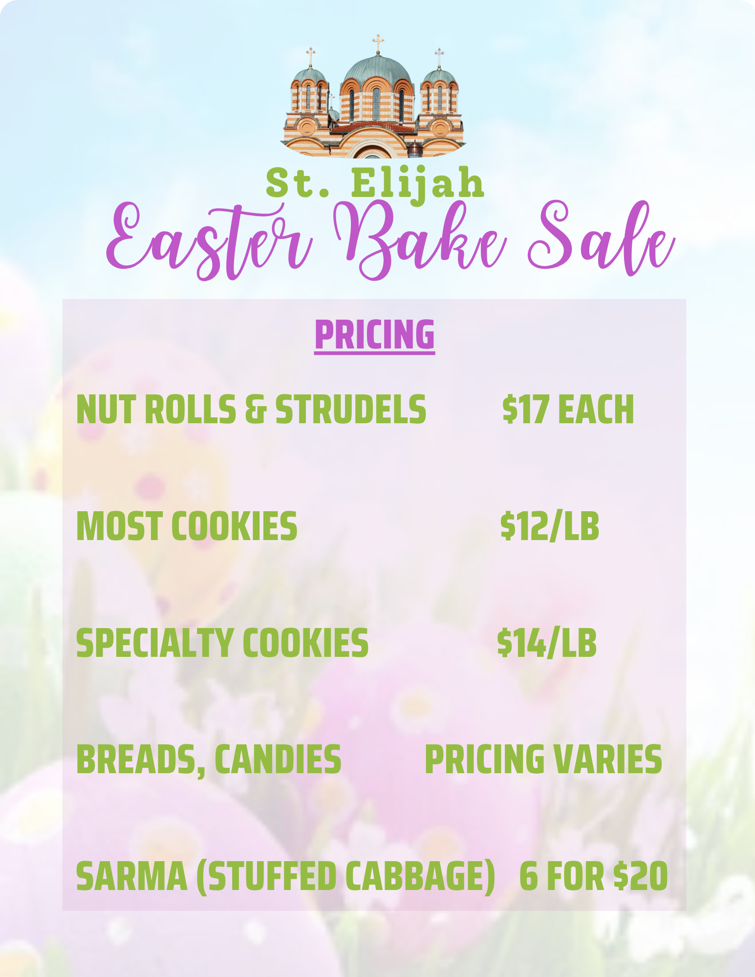 St. Elijah Kolo Easter Bake Sale Pre-orders are officially closed. Please visit the bake sale this Thursday and Friday to order your nut rolls, strudels, and assorted cookies. Thursday, April 2 - 10am - 6pmFriday, April 3 - 10am - 2pmSt. Elijah Event Center - 8700 Taft St., Merrillville
